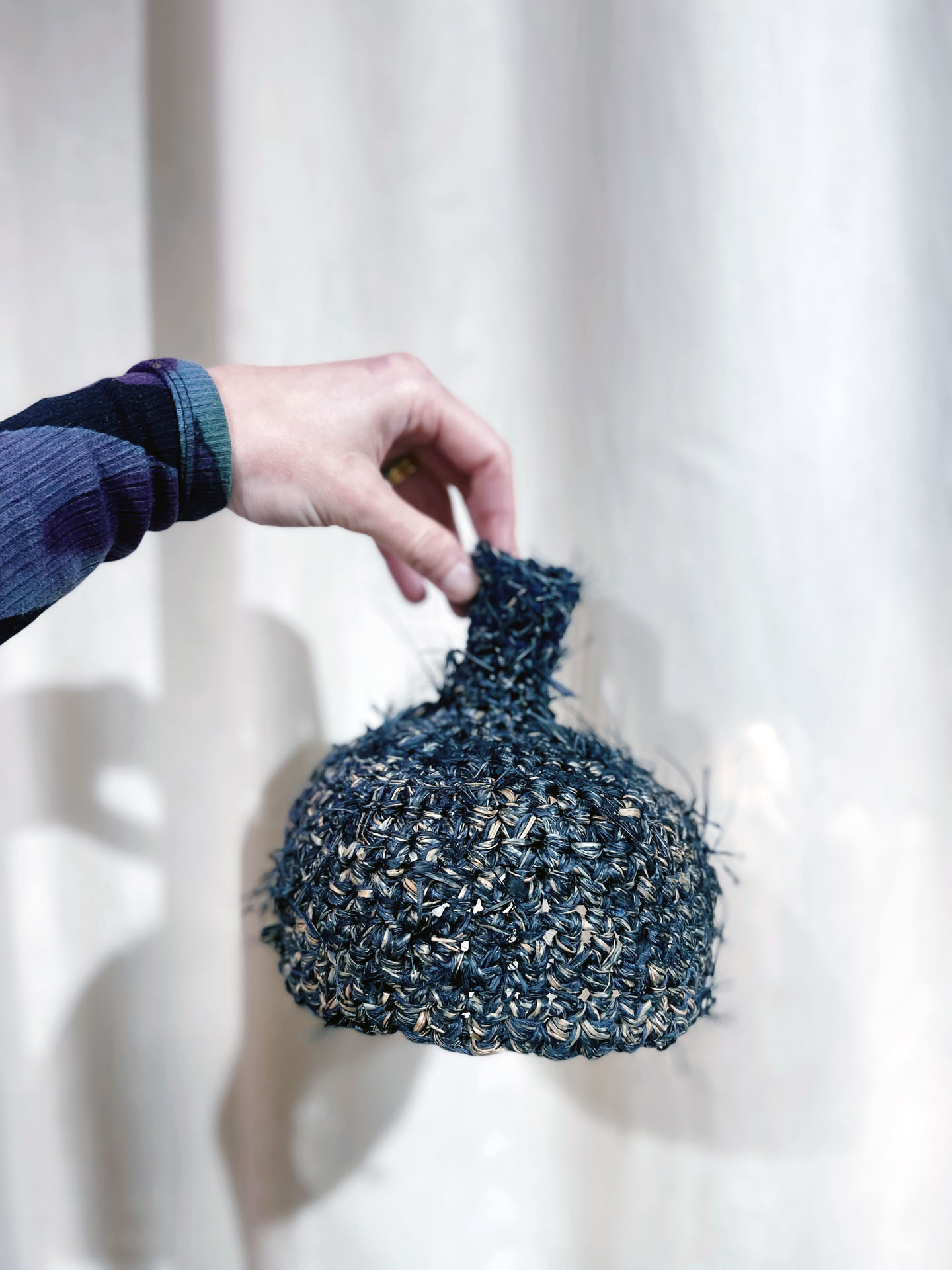 This piece is atypically made out of crocheted raffia and soft cotton yarn. Its rough appearance is in contrast with its comfy fit.