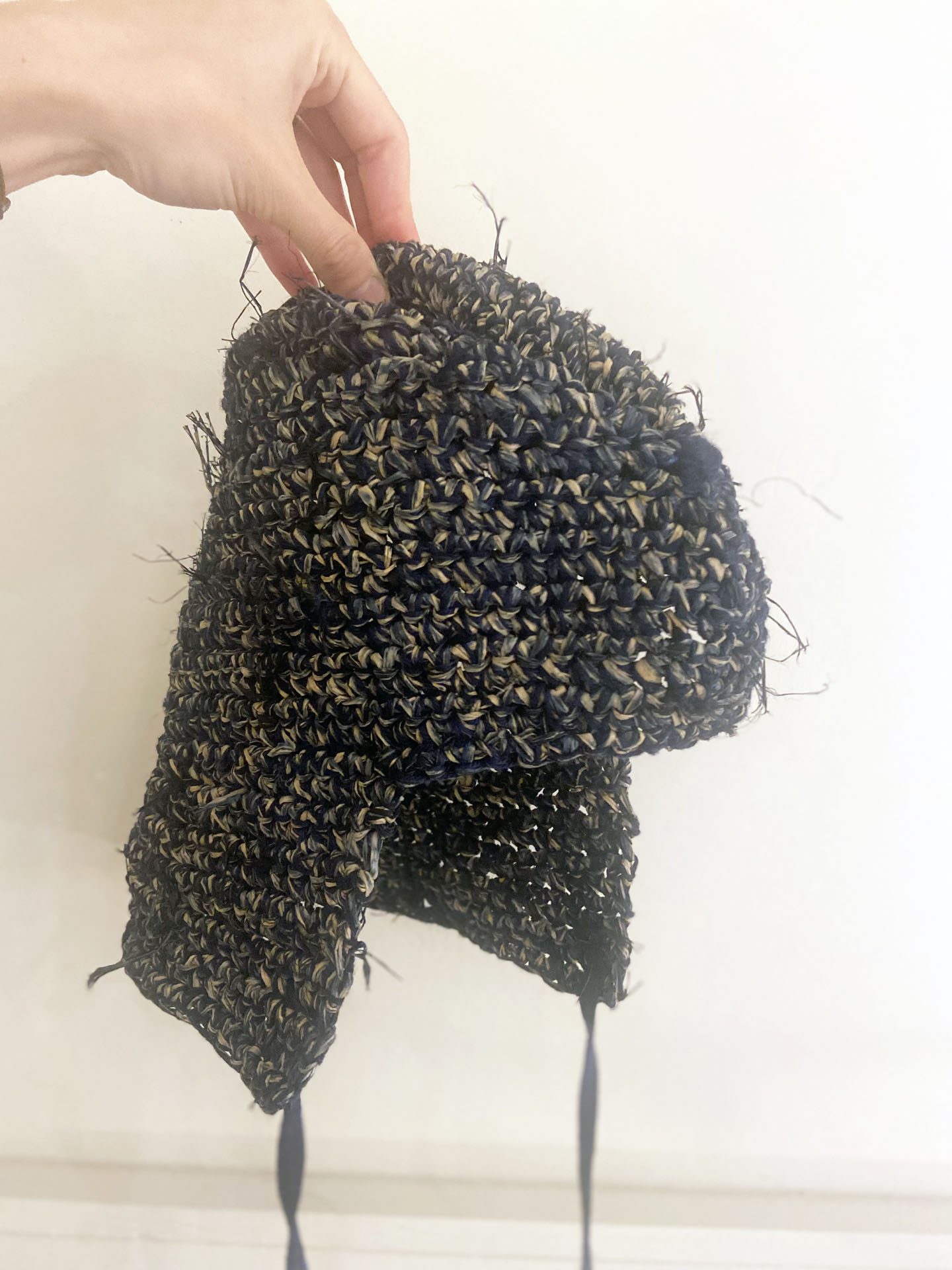This piece is atypically made out of crocheted raffia and soft cotton yarn. Its rough appearance is in contrast with its comfy fit.
