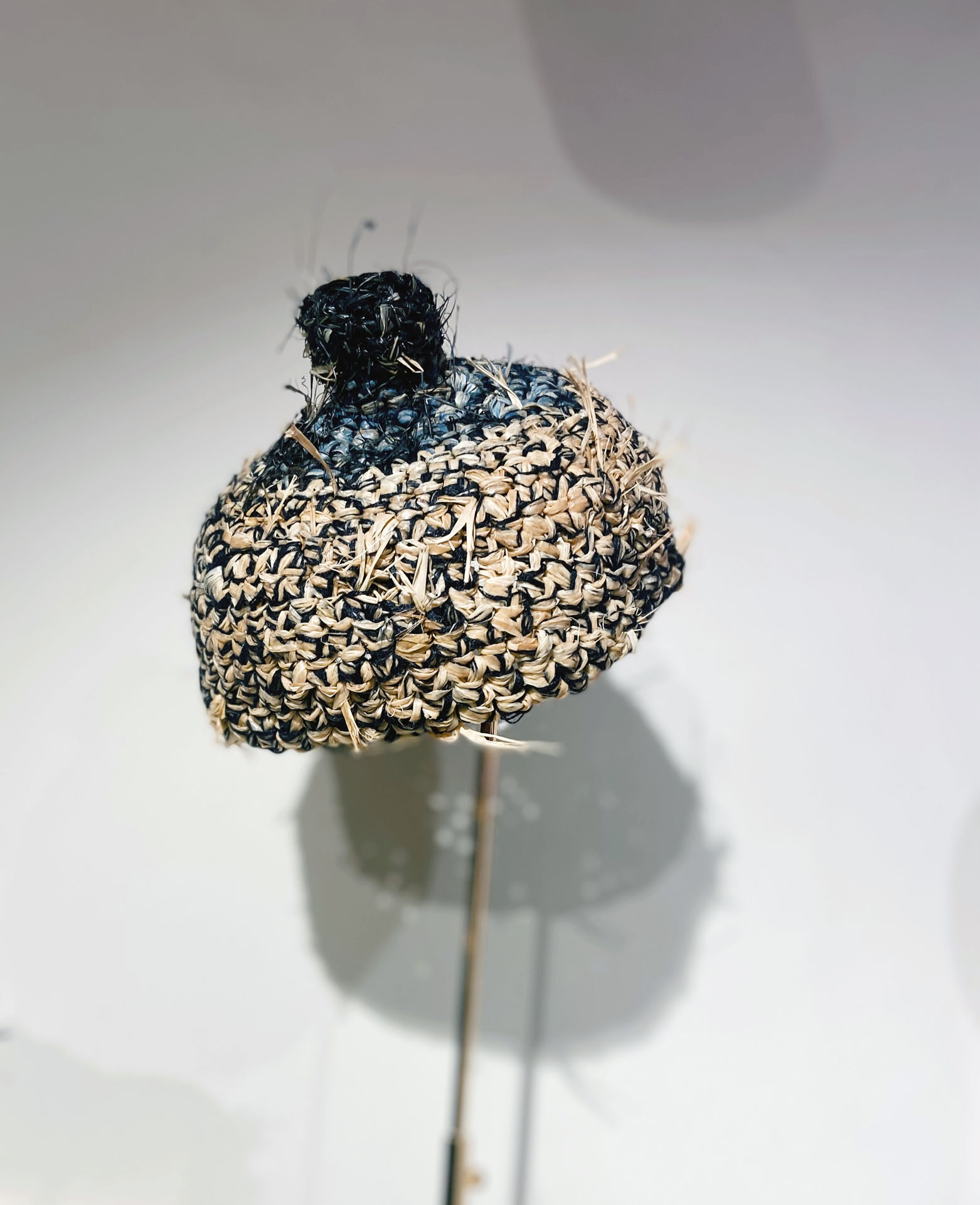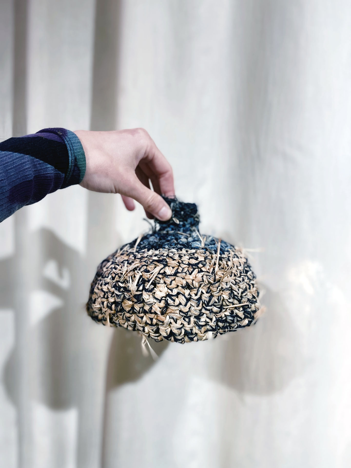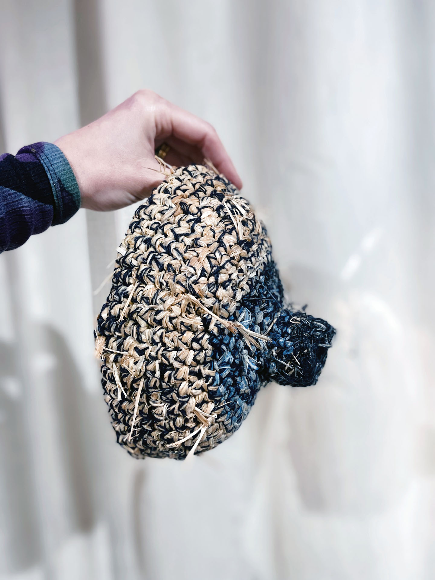 This piece is atypically made out of crocheted raffia and soft cotton yarn. Its rough appearance is in contrast with its comfy fit.
