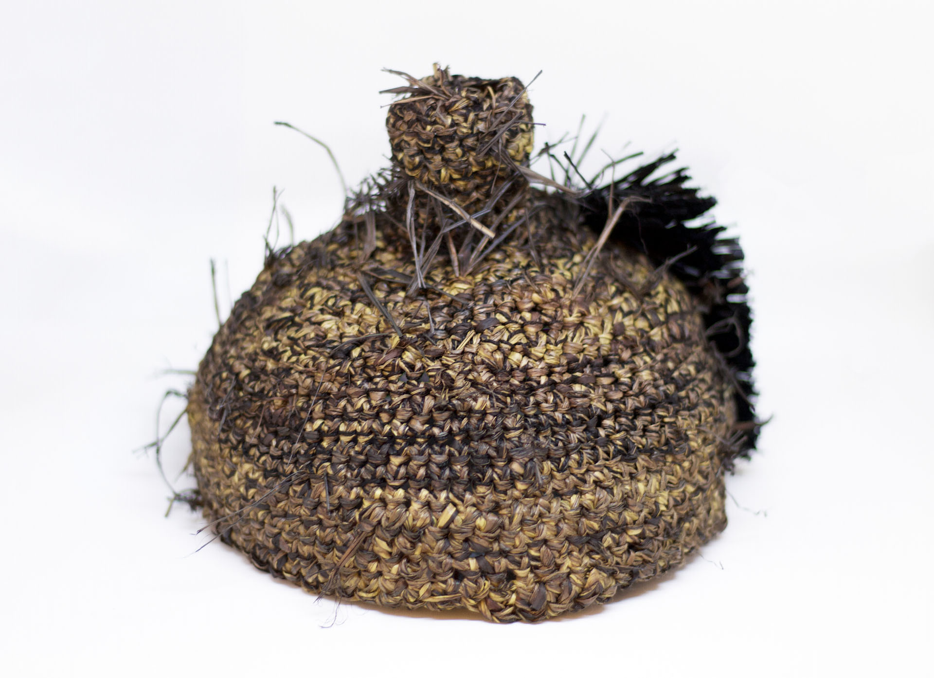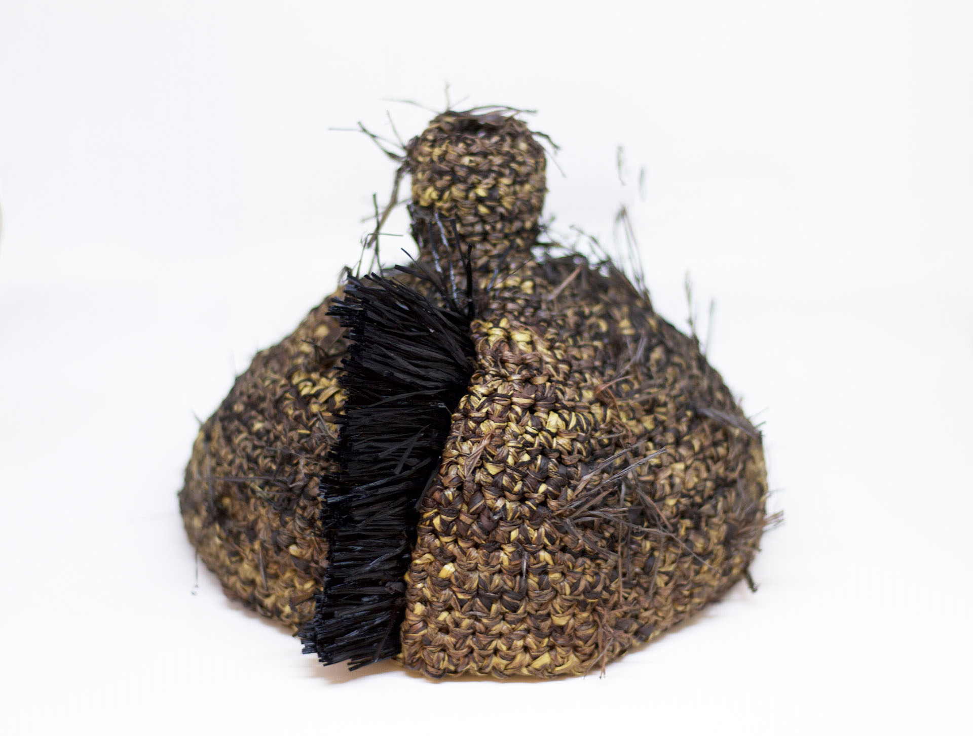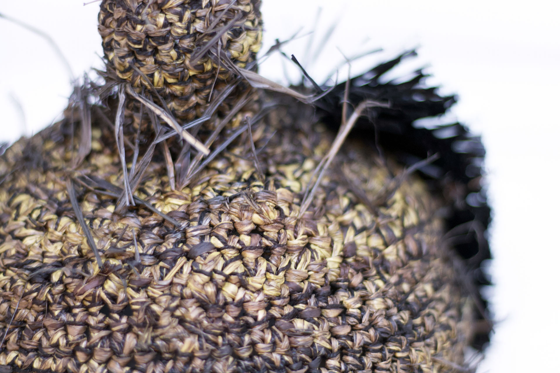 This piece is atypically made out of crocheted raffia and soft cotton yarn. Its rough appearance is in contrast with its comfy fit.