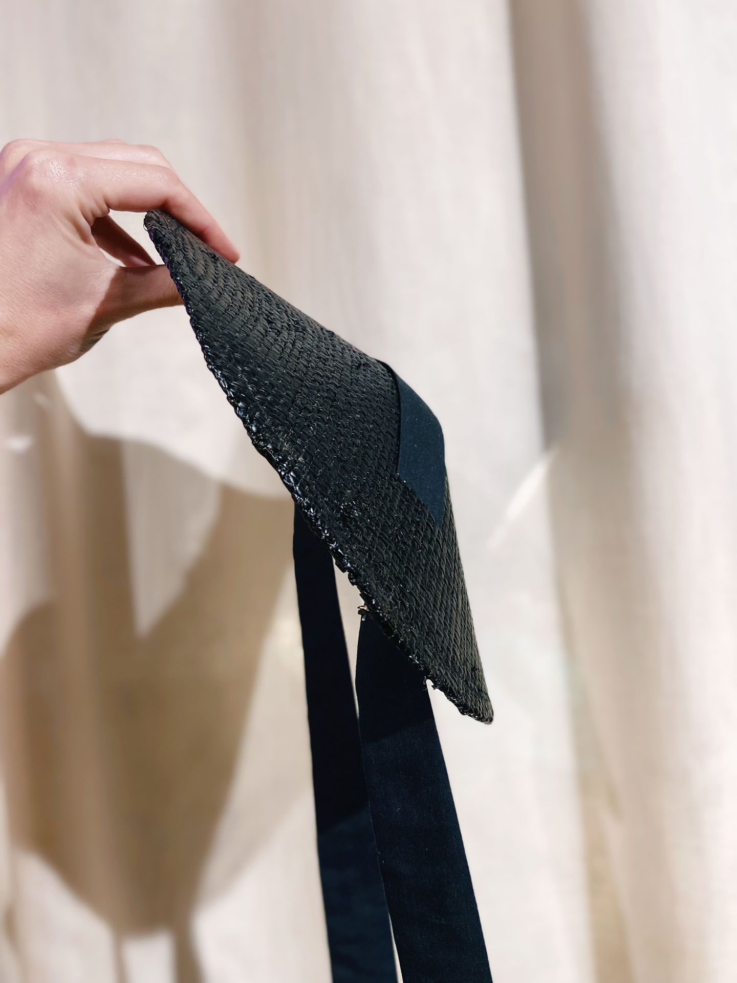 This piece is atypically made out of crocheted raffia. Its rough appearance is in contrast with its comfy fit.