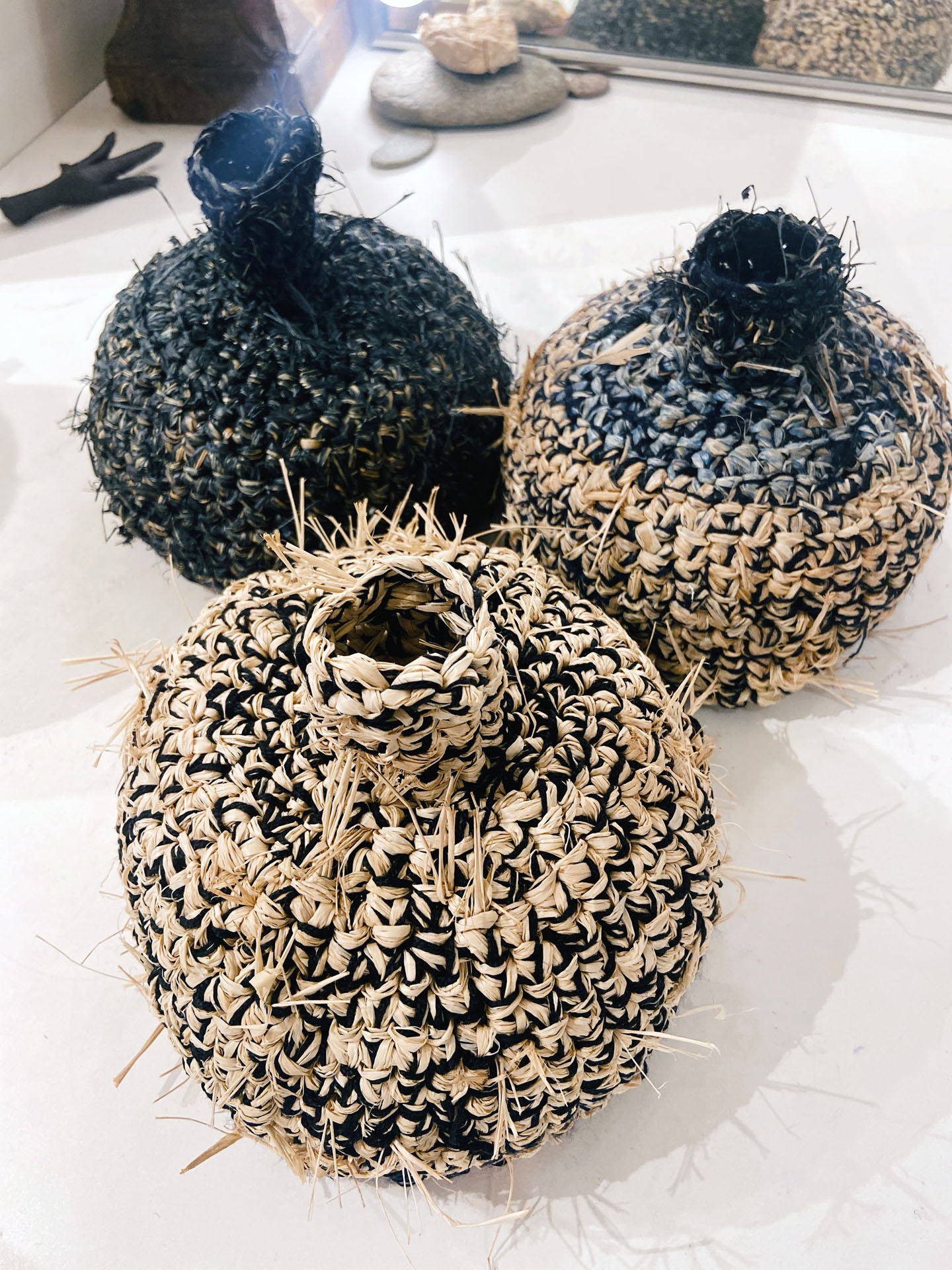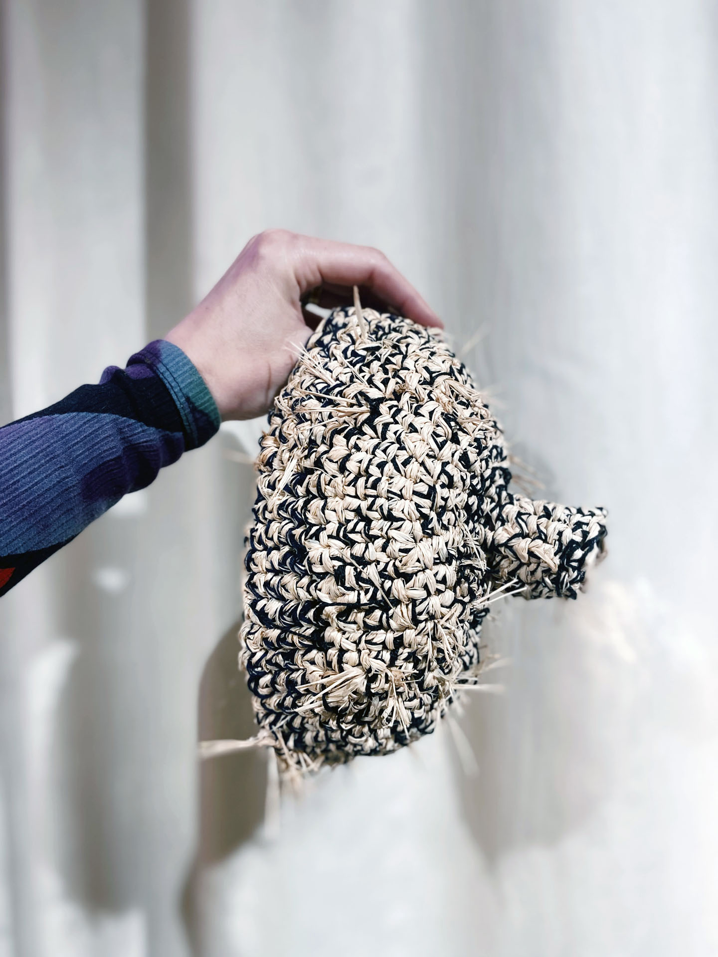This piece is atypically made out of crocheted raffia and soft cotton yarn. Its rough appearance is in contrast with its comfy fit.
